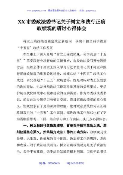 / XX市委政法委书记关于树立和践行正确政绩观的研讨心得体会
