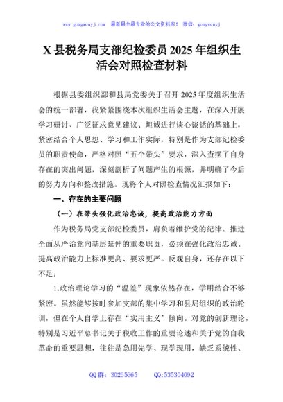 / X县税务局支部纪检委员2025年组织生活会对照检查材料