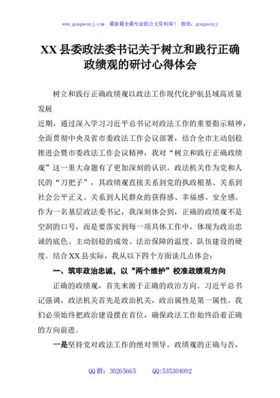 / XX县委政法委书记关于树立和践行正确政绩观的研讨心得体会