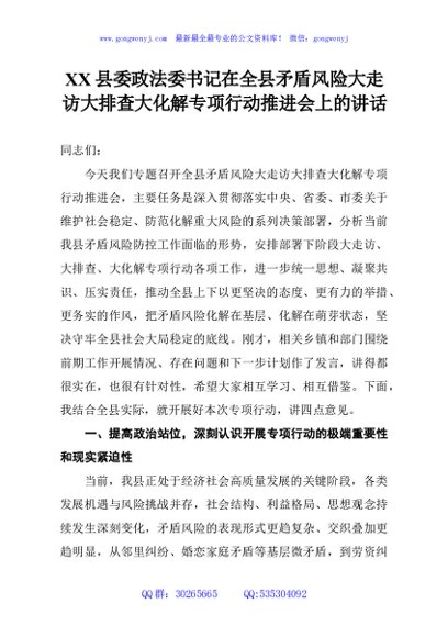 / XX县委政法委书记在全县矛盾风险大走访大排查大化解专项行动推进会上的讲话