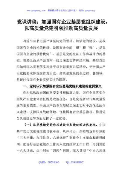 / 党课讲稿:加强国有企业基层党组织建设,以高质量党建引领推动高质量发展
