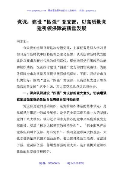 / 党课:建设“四强”党支部,以高质量党建引领保障高质量发展