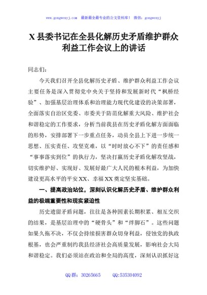 / X县委书记在全县化解历史矛盾维护群众利益工作会议上的讲话