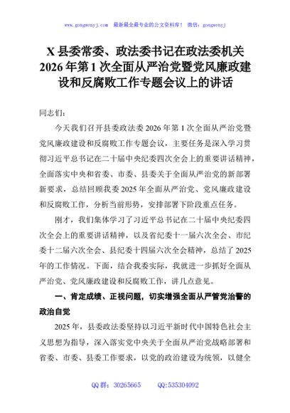 / X县委常委、政法委书记在政法委机关2026年第1次全面从严治党暨党风廉政建设和反腐败工作专题会议上的讲话