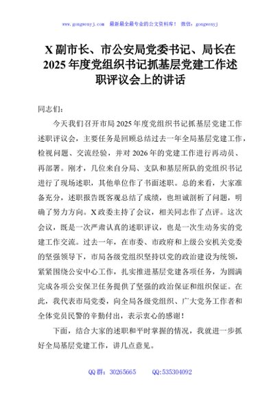 / X副市长、市公安局党委书记、局长在2025年度党组织书记抓基层党建工作述职评议会上的讲话