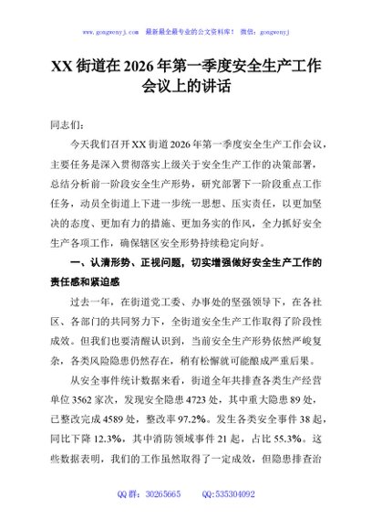 / XX街道在2026年第一季度安全生产工作会议上的讲话