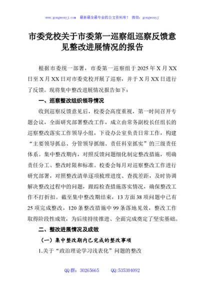 / 市委党校关于市委第一巡察组巡察反馈意见整改进展情况的报告