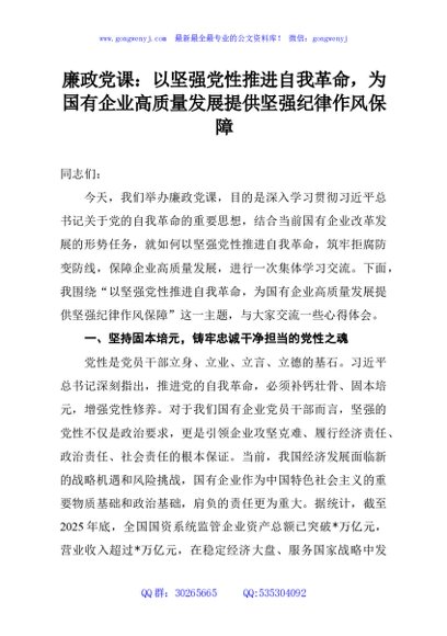 / 廉政党课:以坚强党性推进自我革命,为国有企业高质量发展提供坚强纪律作风保障