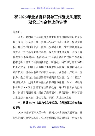 / 在2026年全县自然资源工作暨党风廉政建设工作会议上的讲话