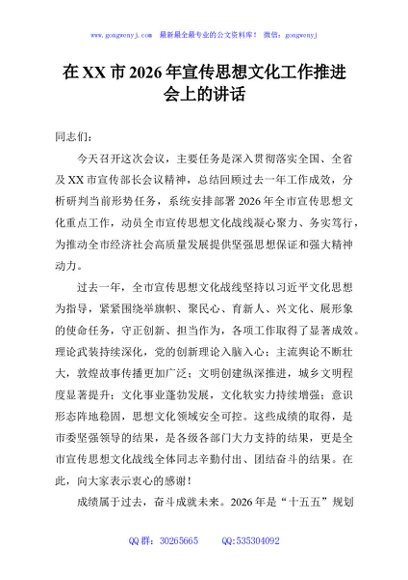 / 在XX市2026年宣传思想文化工作推进会上的讲话