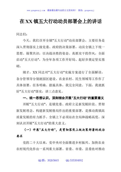 / 在XX镇五大行动动员部署会上的讲话