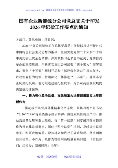 / 国有企业新能源分公司党总支关于印发2026年纪检工作要点的通知