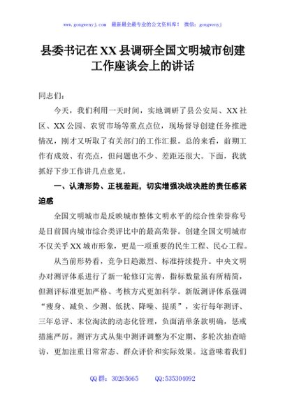 / 县委书记在XX县调研全国文明城市创建工作座谈会上的讲话