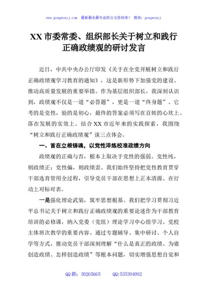 / XX市委常委、组织部长关于树立和践行正确政绩观的研讨发言