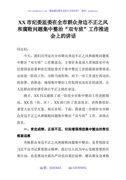 / XX市纪委监委在全市群众身边不正之风和腐败问题集中整治“双专班”工作推进会上的讲话