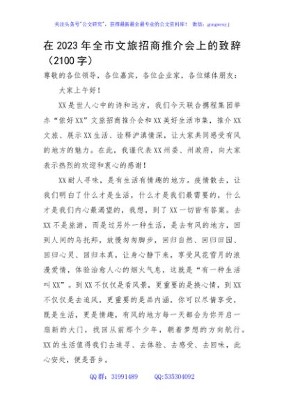 / 在2023年全市文旅招商推介会上的致辞