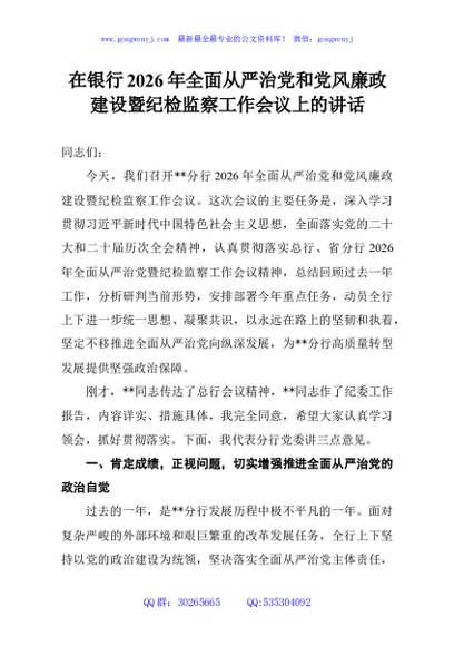 / 在银行2026年全面从严治党和党风廉政建设暨纪检监察工作会议上的讲话