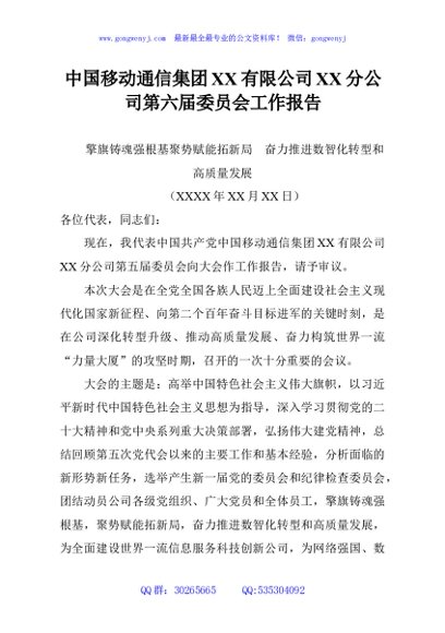 / 中国移动通信集团XX有限公司XX分公司第六届委员会工作报告