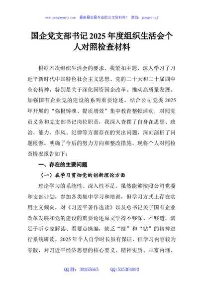 / 国企党支部书记2025年度组织生活会个人对照检查材料