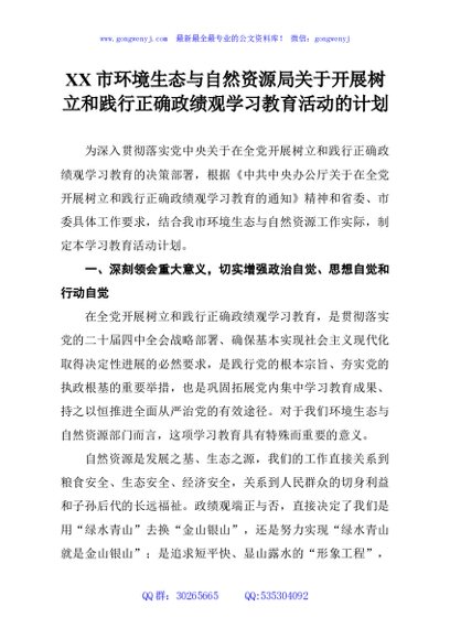 / XX市环境生态与自然资源局关于开展树立和践行正确政绩观学习教育活动的计划