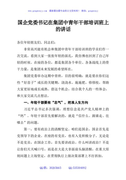 / 国企党委书记在集团中青年干部培训班上的讲话