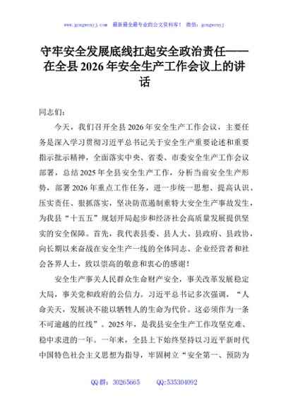 / 守牢安全发展底线扛起安全政治责任——在全县2026年安全生产工作会议上的讲话