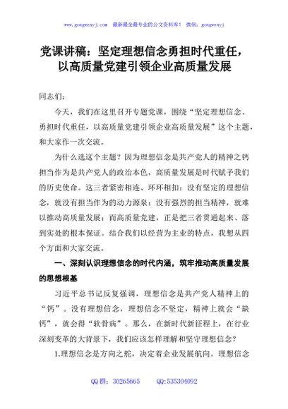 / 党课讲稿:坚定理想信念勇担时代重任,以高质量党建引领企业高质量发展