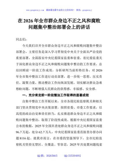 / 在2026年全市群众身边不正之风和腐败问题集中整治部署会上的讲话