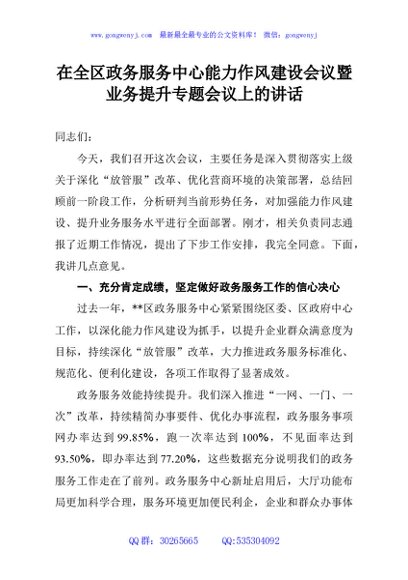/ 在全区政务服务中心能力作风建设会议暨业务提升专题会议上的讲话