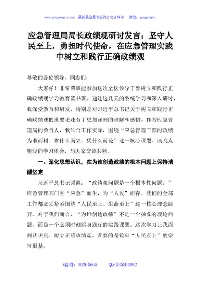 / 应急管理局局长政绩观研讨发言:坚守人民至上,勇担时代使命,在应急管理实践中树立和践行正确政绩观