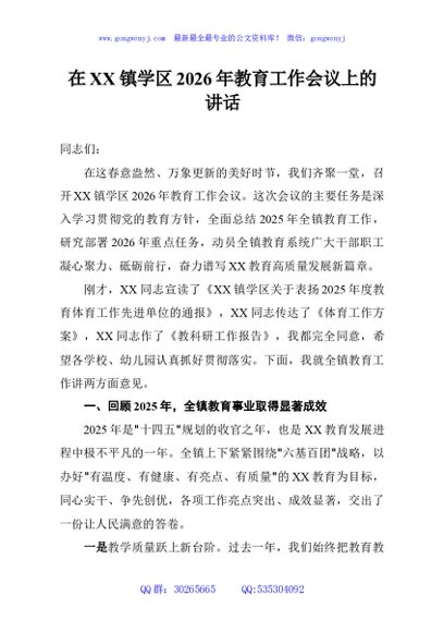 / 在XX镇学区2026年教育工作会议上的讲话