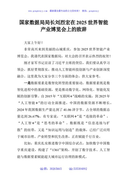 未生成预览图,长按二维码添加 国家数据局局长刘烈宏在2025世界智能产业博览会上的致辞 - 公文研究