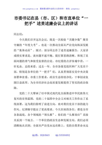 / 市委书记在县(市、区)和市直单位“一把手”述责述廉会议上的讲话