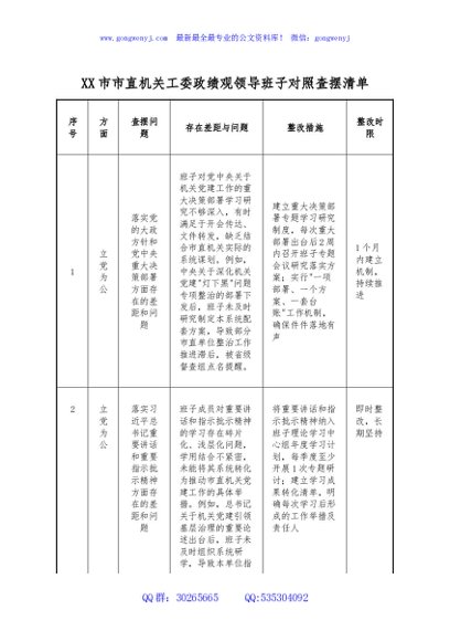 / XX市市直机关工委政绩观领导班子对照查摆清单