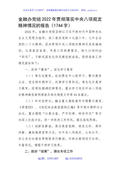 / 金融办党组2022年贯彻落实中央八项规定精神情况的报告