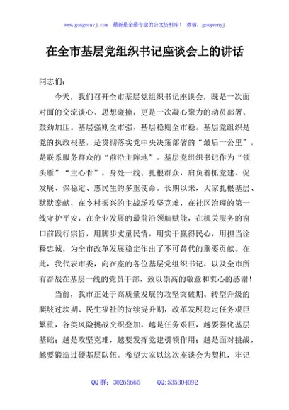 / 在全市基层党组织书记座谈会上的讲话
