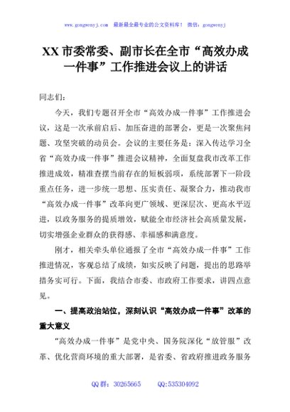 / XX市委常委、副市长在全市“高效办成一件事”工作推进会议上的讲话