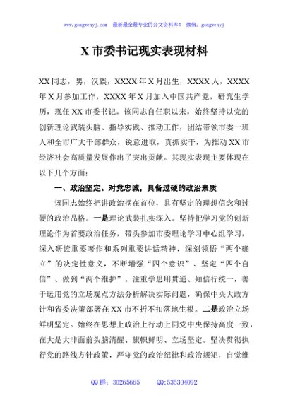 / X市委书记现实表现材料
