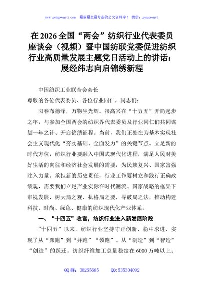 在2026全国“两会”纺织行业代表委员座谈会(视频)暨中国纺联党委促进纺织行业高质量发展主题党日活动上的讲话:展经纬志向启锦绣新程