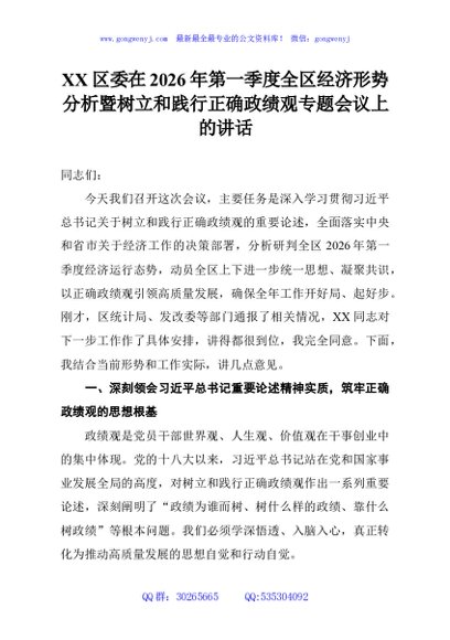 / XX区委在2026年第一季度全区经济形势分析暨树立和践行正确政绩观专题会议上的讲话
