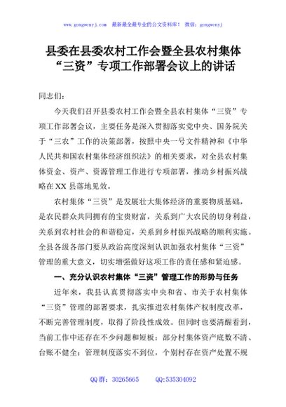 / 县委在县委农村工作会暨全县农村集体“三资”专项工作部署会议上的讲话