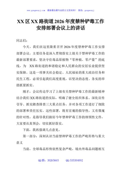 / XX区XX路街道2026年度禁种铲毒工作安排部署会议上的讲话