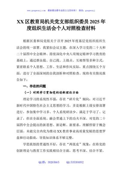 / XX区教育局机关党支部组织委员2025年度组织生活会个人对照检查材料