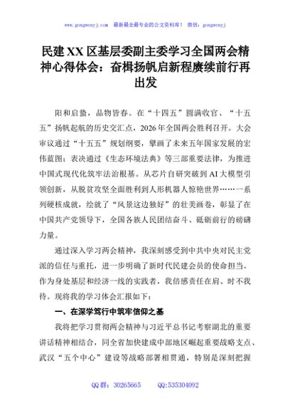 / 民建XX区基层委副主委学习全国两会精神心得体会:奋楫扬帆启新程赓续前行再出发