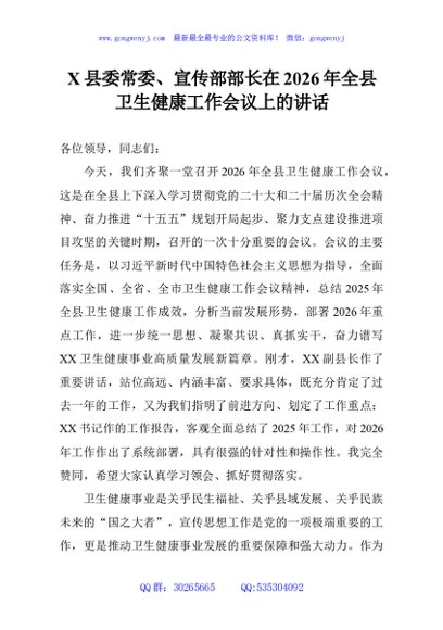 / X县委常委、宣传部部长在2026年全县卫生健康工作会议上的讲话