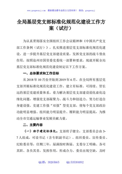 / 全局基层党支部标准化规范化建设工作方案(试行)