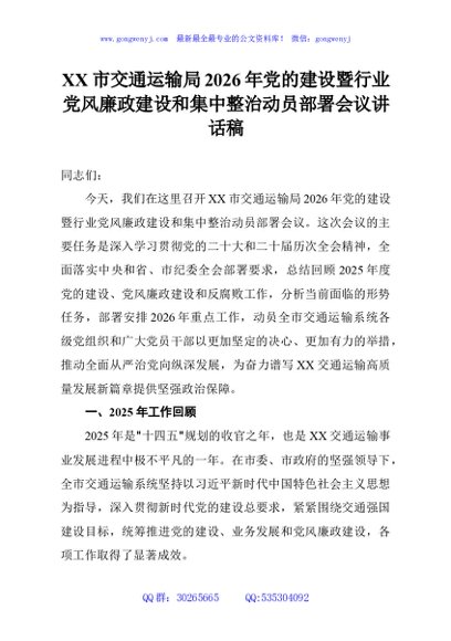 / XX市交通运输局2026年党的建设暨行业党风廉政建设和集中整治动员部署会议讲话稿
