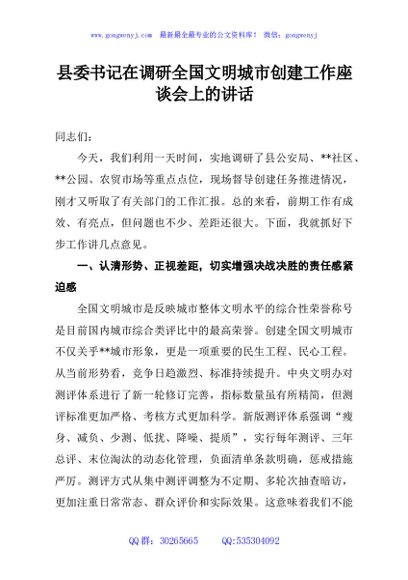 / 县委书记在调研全国文明城市创建工作座谈会上的讲话