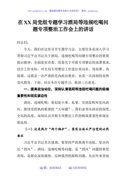 / 在XX局党组专题学习酒局等违规吃喝问题专项整治工作会上的讲话