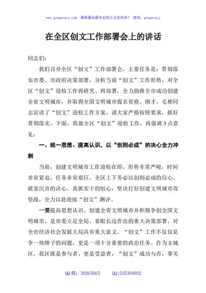 / 在全区创文工作部署会上的讲话